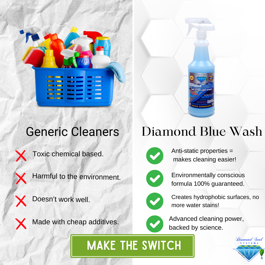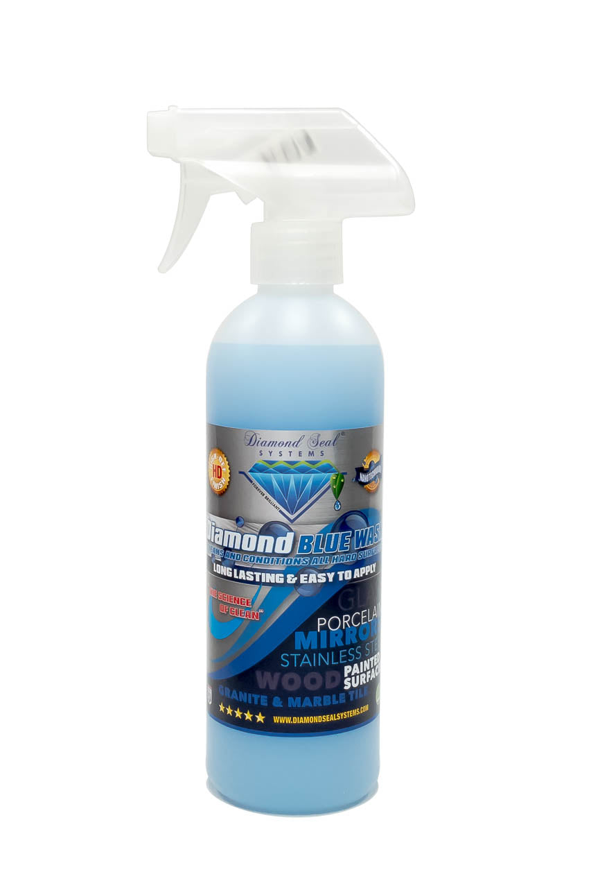 Diamond Blue Wash is an environmentally-friendly, water-based cleaner/polisher that dissolves and lifts oily grime and dirt on most hard surfaces. Excellent on glass, mirrors, granite/stone counters, stainless steel, chrome, fiberglass, porcelain sinks and counters, painted surfaces, vinyl, plastic and wood.