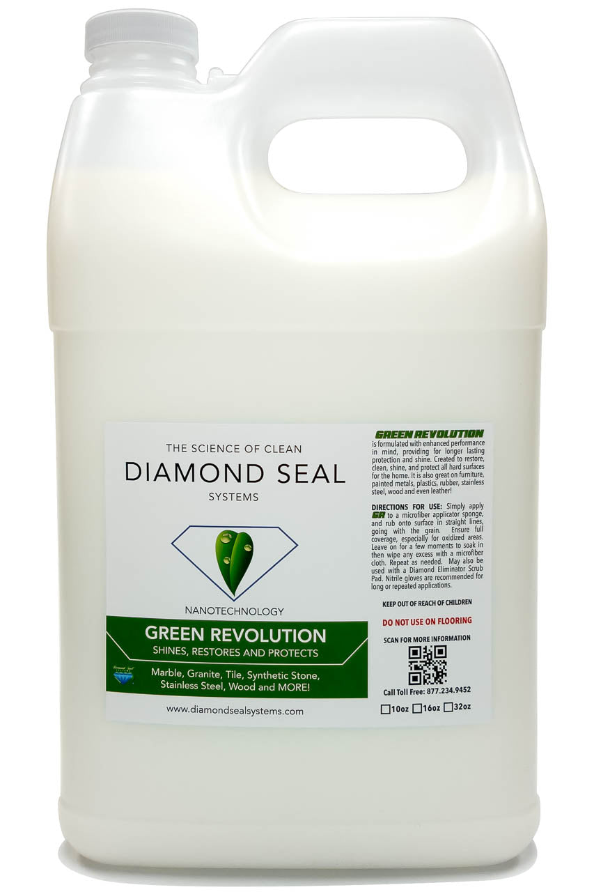 Use Green Revolution Cleaner by applying it to a clean and dry surface. Apply product in straight lines two or three times, making sure that the product is infusing into surface. This is especially important on oxidized surfaces for restoration. We recommend using rubber gloves for long applications and multiple uses. Note - product will not stain fabrics. Combine with other Diamond Seal Systems maintenance products for enhanced performance and longer lasting results.