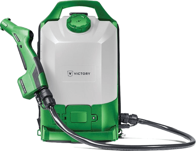 Our Professional Cordless Electrostatic Backpack Sprayer is designed to allow the professional to cover up to 23,000 square feet on a single tank of fluid (coverage per tank is determined by internal testing using flow rate and particle size). In addition, it is designed to save time and labor, spray less liquid, and cover more surfaces. Victory Sprayers’ patented technology provides an electrical charge to solutions, allowing them to wrap conductive surfaces with an effective and even coverage. Double-charged particles envelope all conductive surfaces – shadowed, vertical and underneath.